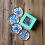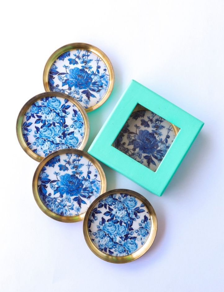 Set of 4 elegant blue floral coasters with golden rim, packed in a stylish gift box. Perfect for home use, festive décor, and gifting.